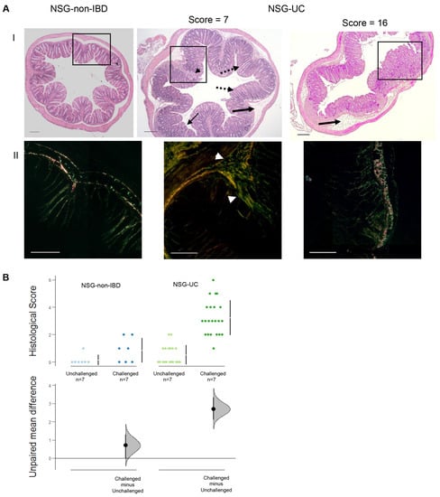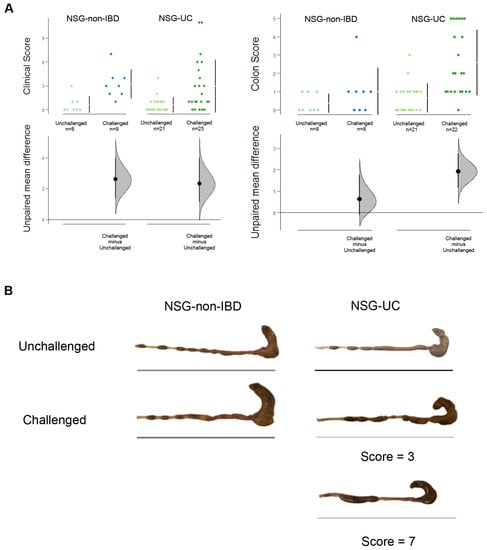 The clinical scores in the unchallenged NSG-non-IBD and NSG-UC mice fluctuated around a mean value of 0.6, most likely reflecting variability in weight measurements. Upon challenge with ethanol, the clinical score increased in both groups significantly, indicating that the rectal application of ethanol had an impact on the mice (mean value of 3.2 and 2.6, respectively, for unchallenged versus challenge; NSG-non-IBD: p = 0.055; NSG-UC: p = 0.01; ANOVA followed by Tukey’s HSD). On day 18, the mice were euthanized, and their colon was removed, subjected to macroscopic inspection, and classified according to a macroscopic score as described in Section 4. Here, a clear difference was observed between the two models. In contrast to the challenged NSG-non-IBD mice, the colons of the ethanol-challenged NSG-UC mice exhibited unformed pellets, dilatation and colon shortening. In general, the macroscopic inspection of the colon corroborated the clinical score (Figure 2).