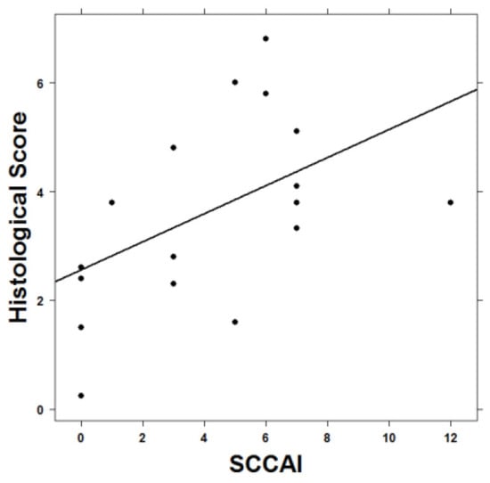 Pearson’s product-moment correlation analysis of murine histological scores and human clinical SCCAI scores depicted as a scatter plot. The SCCAI scores of patients whose PBMCs were used for reconstitution were correlated with the mean values of the histological scores of the respective NSG−UC mice challenged with ethanol.