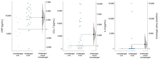To validate the observations obtained from the analysis of clinical scores, inflammatory markers associated with the inflammatory processes were analyzed (UC 3-5). Figure 5 provides an example of common inflammatory markers, such as msCCL-7, msCRP and msIL-6, which were analyzed in protein extracts from the distal parts of the colon and using Luminex. All selected markers were significantly elevated upon challenge with ethanol (CCL-7: unchallenged mean = 679.5 ± 702.31 pg/mL, challenged mean = 3382.81 ± 3540 pg/mL, p = 0.001; CRP: unchallenged mean = 6232.37 ± 2642 pg/mL, challenged mean = 9481.12 ± 2807 pg/mL, p = 0.01 (Student’s t-test); IL-6: unchallenged mean = 5.5 ± 2.9 pg/mL, challenged mean = 1415 ± 3872 pg/mL, p = 0.02 (Wilcoxon rank-sum test)).