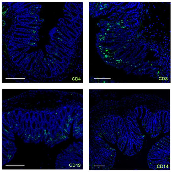 Cells of human origin migrate into the mucosa and submucosa. Sections from the distal parts of the colon were stained with green Alexafluor anti-human CD4, CD8, CD19 and CD14. Scale bar represents 100 µm.