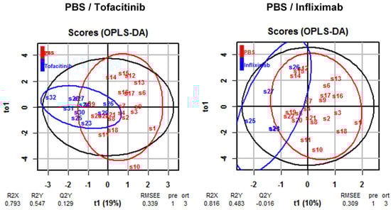 One noticeable issue in this study is inherent variability, which includes the impact of the immunological background of the donor and the variability in scores and expressions of markers within each group. Therefore, a comprehensive analysis of all markers is necessary to obtain reliable results. In most of our studies, we applied OPLS-DA analysis, which not only allows a comparison of the efficacy of therapeutics but also provides quantitative data. Figure 8 presents an example of an OPLS-DA analysis between Infliximab- and Tofacitinib-treated mice (Figure 8). Tofacitinib showed lower R2X and higher R2Y and Q2y values, and a higher RMSSE value.