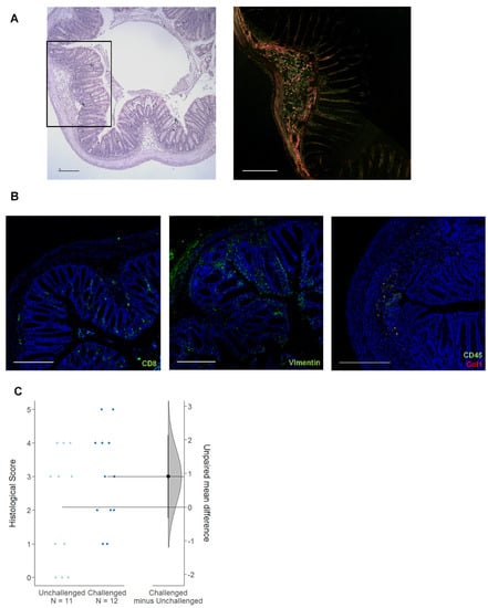 The impact of the immunological background of the donor was also obvious in the NSG-CD model. While the treatment scheme was identical to the NSG-UC model, the pathological manifestations differed (Figure 9) [24]. In the NSG-CD mice, the development of edema and the influx of inflammatory cells were less prominent compared to the NSG-UC mice, and complete destruction of the mucosa was rarely observed. However, a thickening of the muscularis mucosae and an enlargement of the submucosa were frequently observed (Figure 9A). These areas exhibited collagen deposition and the presence of fibroblasts and fibrocytes (Figure 9B). Additionally, unlike the NSG-UC mice, there was no significant difference in the histological score between the unchallenged (mean = 2.21 ± 1.47) and challenged mice (mean = 3.53 ± 2.02), suggesting that patient-derived PBMCs can spontaneously induce remodeling of inflammatory response (Figure 2). In this analysis, only matched groups were selected (CD1, 3). Human CD8+ cytotoxic T cells were detected in the sections of the NSG-CD mice (Figure 9B), although the influx of inflammatory cells was negligible compared to the NSG-UC mice.