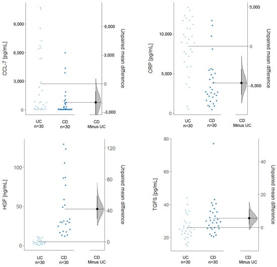 Inflammatory and remodeling markers are differentially expressed in the NSG−UC and NSG−CD models. Levels of CCL−7 (UC: N = 5, n = 30; CD: N = 5, n = 30), CRP (UC: N = 5, n = 30; CD: N = 5, n = 30), TGFß (UC: N = 5, n = 30; CD: N = 5, n = 30), and HGF (UC: N = 4, n = 30; CD: N = 4, n = 24) depicted as Cumming plots. The upper part of the plot presents each data point in a swarmplot. The mean and standard deviation (SD) of each group are plotted as a gapped line, where the vertical lines correspond to the mean ± SD and the mean itself is depicted as a gap in the line. The 0 point of the difference axis is based on the mean of the reference group (control). The dots show the difference between groups (effect size/mean difference). The shaded curve shows the entire distribution of excepted sampling error for the difference between the means (the higher the peak, the smaller the error). The error bar in the filled circles indicates the 95% confidence interval (bootstrapped) for the difference between means. N: no. of donors, n: no. of mice.