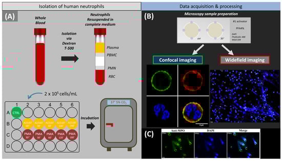 Experimental design. (A) Scheme of neutrophil isolation on dextran followed by cell seeding in a 24-well plate and incubation. (B) Schematic representation of the sample for fluorescence microscopy and imaging by different fluorescence microscopes followed by software processing. (C) Colocalization of decondensed chromatin with myeloperoxidase after neutrophil stimulation with PMA. Blue, staining of chr with DAPI; green, staining of MPO with FITC-conjugated anti-MPO monoclonal antibodies. Scale bar: 25 µm.