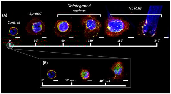 Further processes of cell activation such as spreading, decondensation of chromatin, swelling of nuclei, rupture of membranes, and release of NET traps were recorded at fixed time intervals. Activation was stopped by addition of fixative at 30, 60, 120, 180, and 240 min. Neutrophils were assessed by fluorescence confocal microscopy, and their size and changes in parameters were evaluated over several hours (Figure 5).