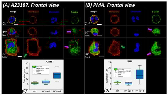 The 30″ type 2 cells differed from both the control and the 30″ type 1 cells. Neutrophils lost their spherical shape and spread randomly on the surface. Pseudopodia appeared at the edges of the membrane (Figure 4A,B, green arrows). The cell diameter increased significantly compared to 30″ type 1, by approximately 1.55-fold (15.08 ± 3.07 μm) for A23187 and approximately 1.75-fold (14.62 ± 4.36 μm) for PMA. At the same time, the cells approximately halved in size (48%) for both activators compared to 30″ type 1 (Figure 4C,D,G,H). Actin retained its granular structure but was distributed throughout the cell volume, unlike 30″ type 1 cells (Figure 4A,B,E,F).