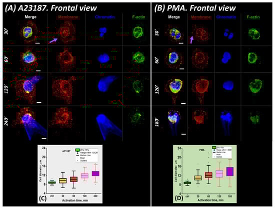 To assess the primary response of neutrophils to activator exposure, cells were fixed 30 s after incubation with A23187 and PMA (Figure 1A,B and Figure 2B). This process was not associated with entropic swelling of the nucleus and occurred significantly faster than chromatin decondensation and will be discussed separately in Section 2.