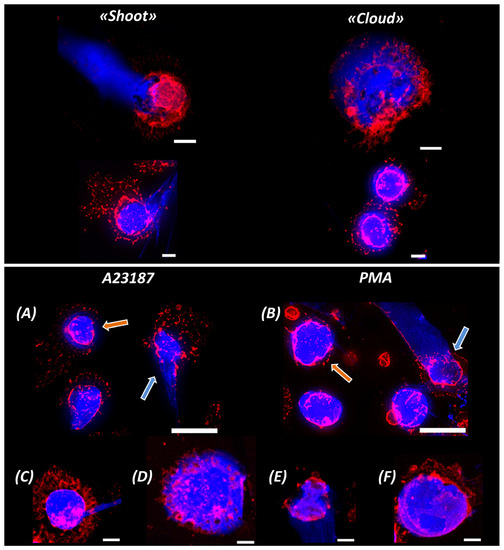 Upper part of the image: characteristic images of NETotic “shoot” and “cloud” cells. Scale bar: 5 μm. (A,B) 240′ after activation by A23187 and 180′ after activation by PMA. Scale bar: 20 μm. Blue arrows indicate “shoot” chromatin ejection, orange arrows indicate “cloud” chromatin ejection. (C,D) 240′ after activation by A23187. (C) “shoot” cells, (D) “cloud” cells. (E,F) 180′ after activation by PMA. (E) “shoot” cells, (F) “cloud” cells. Scale bar: 5 μm. Red indicates WGA + AlexaFluor 594, blue indicates Hoechst 33342.