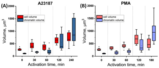 The processes of activation by A23187 and PMA are illustrated by box plots of chromatin volume and cell volume as a function of activation time according to confocal microscopy data, taking into account the scatter of empirical values (Figure 7).
