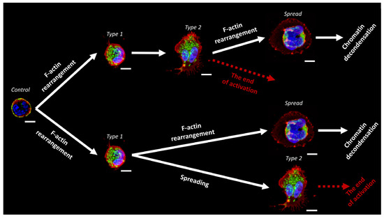 It is likely that the type 1 and type 2 cells are “precursors” to the spreading cell (Figure 8). After addition of the activator, actin rearranges into a granular structure that allows the cell to spread on the surface (type 2) (Figure 8, upper branch). Considering that type 2 cells were also observed 30 min after the addition of activators (Figure 4I,J), type 1 and type 2 cells may represent a common stage of activation, after which the cell can either progress towards NETosis or arrest in the type 2 stage (Figure 8, upper branch).