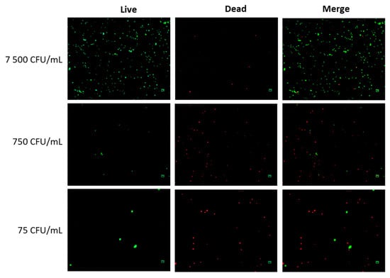 The CPEK were exposed to non-formulated CPB at three different concentrations: 75, 750, and 7500 CFU/mL for a duration of 24 h. When exposed to the concentration of 7500 CFU/mL, there were very few instances of dead bacteria, accounting for only 2% (Figure 1). However, at concentrations of 750 CFU/mL and 75 CFU/mL, a significantly higher number of dead bacteria were observed, representing 81% and 84%, respectively. Moreover, the concentration of 7500 CFU/mL exhibited a significantly greater number of viable bacteria compared to the lowest concentration of 75 CFU/mL (279 versus 5). This finding supports the inverse relationship between the number of viable bacteria and the number of dead bacteria, as higher concentrations result in fewer instances of dead bacteria.