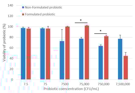 MTT cell viability assay. Canine Progenitors Epidermal Keratinocytes (CPEK) were untreated or treated with formulated or non-formulated probiotic bacteria at various concentrations for 24 h, and cell viability was determined using a colorimetric MTT assay. The results revealed that both the formulated and non-formulated probiotic bacteria were well tolerated by CPEK cells, except at very high concentrations. Here, the control (untreated) group is referred to as 100% viable cells. Data are presented as the mean ± standard deviation of one experiment conducted in duplicate (N = 2). * indicates (p < 0.05).