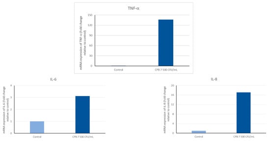 The CPEK were exposed to non-formulated CPB at a concentration of 7500 CFU/mL for a duration of 24 h. Following the treatment, the mRNA expression levels of the inflammatory cytokine markers, namely IL-8, IL-6, and TNF-α, were assessed using quantitative real-time RT-PCR. The findings depicted in Figure 3 demonstrate that the exposure to CPB at 7500 CFU/mL resulted in a substantial upregulation of IL-6, IL-8, and TNF-α mRNA expression, with fold increases of 3, 17, and 136, respectively. Moreover, an increase in IL-8 mRNA expression was observed even at the lowest concentration of 75 CFU/mL.