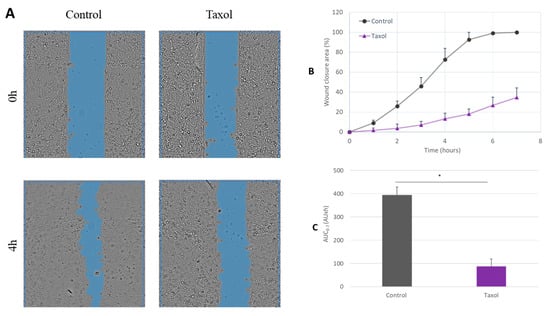 Scratch wound healing assay—the effect of taxol (positive control) on wound healing. Canine Progenitors Epidermal Keratinocytes (CPEK) were seeded into Ibidi® inserts in a 24-well plate and allowed to adhere overnight. Precise and reproducible wounds were created when removing the inserts. Phase contrast images were acquired every hour using CytoSmart Omni live-cell analysis system. (A) Representative phase contrast images of CPEK cells at 0 h and 4 h post-wounding. Wound areas are highlighted in blue. The integrated image analysis algorithm automatically selects the cell-free areas. (B) Progression of scratch wound closure monitored over time in CPEK cells. The wound closure area is expressed as percentage, both in the absence and presence of 100 nM taxol. The scratch area at the 0 h time point was set to 100. (C) The area under the curve (AUC) for the time period of 0 to 7 h was calculated from the line graph. The measurement data are presented as the mean ± SD of two separate experiments conducted in duplicate (N = 4). * indicates (p < 0.05) compared to the control group.