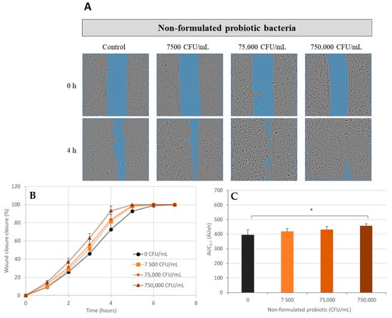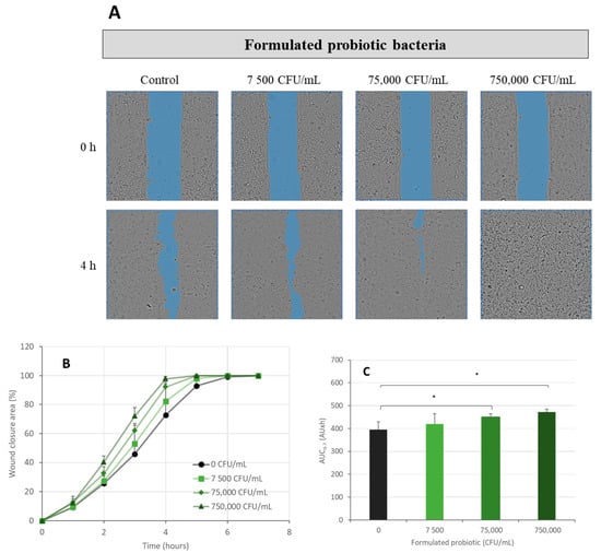 Scratch wound healing assay—the effect of non-formulated probiotic bacteria on wound healing. Canine Progenitors Epidermal Keratinocytes (CPEK) were exposed to non-formulated probiotic bacteria at 7500, 75,000, and 750,000 CFU/mL. (A) Representative phase contrast images of CPEK cells at 0 h and 4 h post-wounding. Wound areas are highlighted in blue. The integrated image analysis algorithm automatically selects the scratch areas. (B) Progression of scratch wound closure monitored over time in CPEK cells. The wound closure area is expressed as percentage, both in the absence and presence of non-formulated probiotic bacteria. (C) The area under the curve (AUC) for the time period of 0 to 7 h was calculated from the line graph. The measurement data are presented as the mean ± SD of two separate experiments conducted in duplicate (N = 4). * indicates (p < 0.05) compared to the control group.