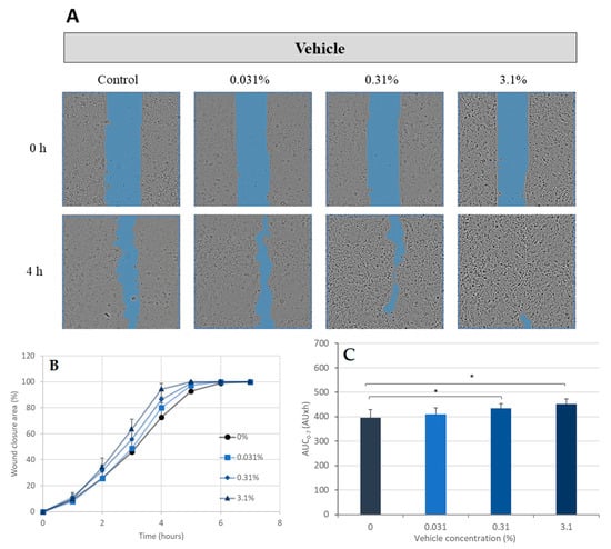 Scratch wound healing assay—the effect of vehicle on wound healing. Canine Progenitors Epidermal Keratinocytes (CPEK) were exposed to the vehicle used in the formulation of the cocktail of probiotic bacteria at 0.031%, 0.31%, and 3.1%. (A) Representative phase contrast images of CPEK cells at 0 h and 4 h post-wounding. Wound areas are highlighted in blue. (B) Progression of scratch wound closure monitored over time in CPEK cells. The scratch area at the 0 h time point was set to 100. (C) The area under the curve (AUC) for the time period of 0 to 7 h was calculated from the line graph. The measurement data are presented as the mean ± SD of two separate experiments conducted in duplicate (N = 4). * indicates (p < 0.05) compared to the control group.