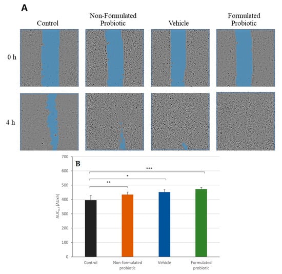 Scratch wound healing assay. Comparison of formulated and non-formulated probiotic bacteria on wound healing. Canine Progenitors Epidermal Keratinocytes (CPEK) exposed to formulated or non-formulated probiotic bacteria at 750,000 CFU/mL, or with the vehicle alone at 3.1%. (A) Representative phase contrast images of CPEK cells at 0 h and 4 h post-wounding. Wound areas are highlighted in blue. (B) Area under the curve (AUC) for the time period of 0 to 7 h. The measurement data are presented as the mean ± SD of two separate experiments conducted in duplicate (N = 4). * indicates (p < 0.05) compared to the control group. ** indicates (p < 0.01) compared to the control group. *** indicates (p < 0.005) compared to the control group.