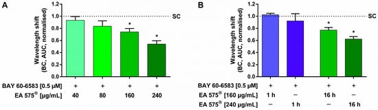 In order to examine whether the observed effect results from direct inhibition of the receptor, pre-incubation of HEK cells with EA 575® was conducted for 1 and 16 h. A reduction in wavelength shifts was exclusively observed with 16 h of pre-incubation time, while a shorter incubation period of 1 h did not alter BAY 60-6583-mediated wavelength shifts (Figure 1B).
