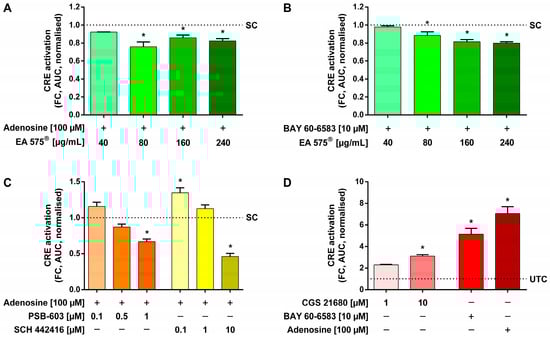 Influence of EA 575® (A,B) or the antagonists PSB-603 and SCH 442416 (C) on the CRE activation in transiently transfected HEK cells mediated by stimulation with adenosine (A,C) or BAY 60-6583 (B). Pre-incubation with 40–240 µg/mL EA 575® was conducted for 16 h (A,B) or with 0.1–10 µM of the antagonists for 2 h (C) before cells were stimulated by adding 100 µM adenosine (A,C) or 10 µM BAY 60-6583 (B). The non-specifically mediated CRE activation was significantly inhibited by pre-incubation with 80–240 µg/mL EA 575® (A) or 1 µM PSB-603 (C), compared to stimulated control cells not pre-incubated with EA 575® (SC). SCH 442416 also significantly reduced the CRE activation at a concentration of 10 µM, whereas this effect could not be observed at lower concentrations of both antagonists. Instead, 0.1 µM SCH 442416 slightly increased the CRE activation (C). The inhibition of the specific A2BAR-mediated CRE activation was achieved by pre-incubation with 80–240 µg/mL EA 575® (B). Influence of the A2AAR agonist CGS 21680 and, in comparison, BAY 60-6583 and adenosine on the CRE activation in transiently transfected HEK cells (D). Stimulation was performed with 1–10 µM CGS 21680, 10 µM BAY 60-6583, or 100 µM adenosine. The A2AAR-mediated CRE activation was significantly increased by 10 µM CGS 21680 compared with completely untreated control cells (UTC), but to a lesser extent than that mediated by A2BAR or non-specifically using adenosine (D). Data are shown as AUC of the fold change (FC) after stimulation normalised to stimulated control cells not pre-incubated with EA 575® (SC) (A–C) or completely untreated control cells (UTC) (D). Results represent the mean and SEM (n = 3 independent experiments performed in triplicate, * p < 0.05).