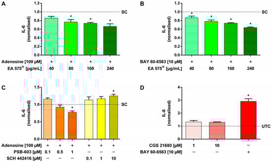 Influence of EA 575® (A,B) or the antagonists PSB-603 and SCH 442416 (C) on the IL-6 release of Calu-3 cells mediated by stimulation with adenosine (A,C) or BAY 60-6583 (B). Pre-incubation with 40–240 µg/mL EA 575® was conducted for 16 h (A,B) or with 0.1–10 µM of the antagonists for 1 h (C) before cells were stimulated by adding 100 µM adenosine (A,C) or 10 µM BAY 60-6583 (B) for another 24 h. The non-specifically mediated IL-6 release was significantly and dose-dependently inhibited by pre-incubation with 80–240 µg/mL EA 575® (A) or 1 µM PSB-603 (C), compared to stimulated control cells not pre-incubated with EA 575® (SC). SCH 442416, however, increased the concentration of IL-6 even further. (C). The inhibition of the specific A2BAR-mediated IL-6 release was achieved by pre-incubation with 40–240 µg/mL EA 575® (B). Influence of the A2AAR agonist CGS 21680 and, in comparison, BAY 60-6583 on the IL-6 release of Calu-3 cells (D). Stimulation was performed with 1–10 µM CGS 21680 or 10 µM BAY 60-6583 for 24 h. The A2AAR-mediated IL-6 release was slightly, but neither significantly nor dose-dependently, increased compared to completely untreated control cells (UTC) (D). Results represent the mean normalised to stimulated control cells not pre-incubated with EA 575® (SC) (A–C) or completely untreated control cells (UTC) (D) and SEM (n = 3 independent experiments performed in triplicate, * p < 0.05).