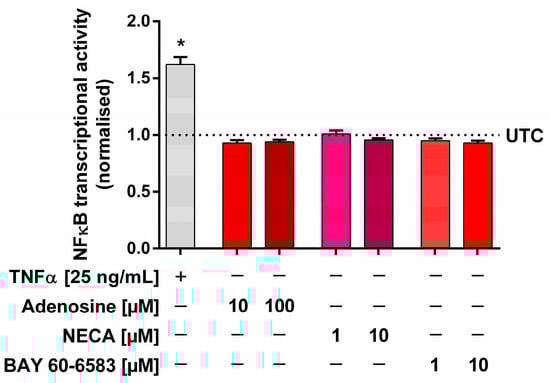 Influence of different adenosine receptor agonists on NFκB transcriptional activity. Calu-3 cells stably expressing a secreted NanoLuc® under control of an NFκB binding sequence were stimulated for 3 h. An amount of 25 ng/mL TNFα was used as positive control, resulting in a significant increase in the luminescence signal. Amounts of 10–100 µM adenosine, 1–10 µM NECA, or 1–10 µM BAY 60-6583 did not show any effect on the NFκB transcriptional activity. Results represent the mean normalised to completely untreated control cells (UTC) and SEM (n = 3 independent experiments performed in triplicate, * p < 0.05).