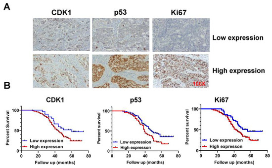 Overexpression of CDK1 was associated with poor prognosis in patients with OC. A total of 147 epithelial OC tissues were stained with antibodies to CDK1, p53, and Ki-67 via IHC (A). Kaplan–Meier survival curves show that CDK1 overexpression is significantly associated with poorer survival compared with OC patients with low CDK1 expression (B) p < 0.01.