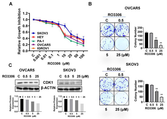 RO-3306 inhibited cell proliferation in OC cells. The Hey, PA-1, IGROV1, OVCAR5, and SKOV3 cells were treated with different concentrations of RO-3306 for 72 h. MTT assay showed that RO-3306 inhibited cell proliferation in a dose-dependent manner in both cell lines (A). Colony assays showed that RO-3306 reduced colony formation in both cell lines after treating cells with RO-3306 for 48 h and continuing to culture cells for 12 days (B). Western blotting confirmed that RO-3306 decreased the expression of CDK1 in both cell lines after 24 h of treatment (C). ** p < 0.01.