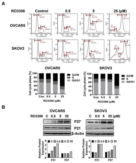 To investigate the underlying mechanism by which RO-3306 inhibited cell growth, the cell cycle profile was analyzed by Cellometer. The OVCAR5 and SKOV3 cells were exposed to different concentrations of RO-3306 for 36 h. As illustrated in Figure 3A, RO-3306 treatment resulted in a dose-dependent reduction in the G1 cell cycle phase and increased the G2 phase in the OVCAR5 cells. The treatment of SKOV3 cells with 5 or 25 µM RO-3306 also significantly reduced the fraction of cells in the G1 phase and increased the proportion of cells in the G2 phase. The population of the G1 phase of OVCAR5 cells and SKOV3 cells reduced from 55.54% to 22.04% and 57.94% to 29.20%, respectively, after 25 µm RO-3306 treatment compared with control groups. Furthermore, 25 µM RO-3306 significantly increased accumulation cells in the G2 phase by 35.75% and 34.55% in OVCAR5 and SKOV3 cells, respectively. Western immunoblotting results showed that RO-3306 increased the expression of p21 and p27, which are both strong inhibitors of cell cycle progression (Figure 3B). These results confirmed that RO-3306 effectively decreased the cell cycle G1 phase in OVCAR5 and SKOV3 cells.