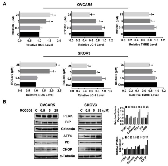 ROS has the potential to cause cellular damage and is known to be a sensitive indicator of oxidative stress in cancer cells. We examined the ROS level and mitochondrial potential using the DCFH-DA, JC-1, and TMRE assays. As shown in Figure 5A, RO-3306 irritated the production of ROS in a dose-dependent manner in both cell lines after 12 h of treatment. Treatment with 25 µM RO-3306 increased ROS production by 55.63% and 127.61% in OVCAR5 and SKOV3, respectively, compared to the control cells. Treatment of both cell lines with different concentrations of RO-3306 also significantly decreased the level of JC-1 and TMRE in a dose-dependent manner in both cell lines, suggesting that RO-3306 may reduce mitochondrial membrane potential in OC cells. Western blotting results showed that RO-3306 induced the expression of cell stress-related proteins such as PERK, BiP, Calnexin, ATF4, PDI, and CHOP in the OVCAR5 and SKOV3 cell lines after 24 h of treatment (Figure 5B). These results demonstrate that cellular stress may also involve the inhibitory effect of RO-3306 on cell proliferation in OC cells.