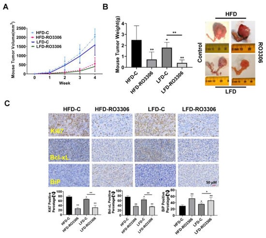 Given that RO-3306 had an anti-proliferative effect in vitro and obesity is known to increase the risk for ovarian cancer, we determined that we had to detect the effect of RO-3306 on tumor growth in a transgenic mouse model of OC (KpB mouse model) under obese and lean conditions. The KpB mice were fed with HFD or LFD at three weeks of age and were then divided into four groups (15 mice/per group), including HFD (obese), HFD+RO-3306, LFD (lean), and LFD+RO-3306. When ovarian tumors reached approximately 0.1 × 0.1 cm by palpation, KpB mice were treated with RO-3306 (4 mg/kg, IP, every three days) for four weeks. The initial mean body weight in obese mice at the start of treatment with RO-3306 was 45.6 gm compared to 28.4 gm in lean mice (p < 0.01). During the RO-3306 or placebo treatment period, the mice maintained normal activity and normal body weight, and no deaths were observed. Compared to the lean mice, the KpB mice fed an HFD had a significant increase in tumor volume and tumor weight, suggesting that an obese environment favors ovarian cancer growth. This is consistent with our prior works [33,34,35]. The obese and lean KpB mice treated with RO-3306 had significantly reduced tumor volume and tumor weight compared to the placebo. RO-3306 reduced tumor weight by 71.25% in obese mice and by 73.76% in lean mice, respectively, compared to their controls (Figure 6A,B). There was no statistical difference in tumor inhibition rates between obese and lean mice after RO3306 treatment, indicating that RO3306 exhibited antitumor activity regardless of obese or lean conditions. We next detected the protein expression of Ki-67, Bcl-xL, and BiP in ovarian tumors after RO-3306 treatment by IHC under obese and lean conditions (Figure 6C). The expression of Ki-67 was significantly reduced by 50.8% and 35.9% in the obese and lean KpB mice treated with RO-3306, respectively, compared to the control mice. RO-3306 reduced Bcl-xL expression in the treated obese mice by 31.44% and by 18.25% in lean mice and increased the expression of Bip from 29.87% to 53.25% in the tumors from the obese group and from 35.56% to 47.13% in the tumors from the lean mice group. These results suggest that RO-3306 inhibits the growth of OC tumors via cellular stress and apoptotic pathways in vivo.