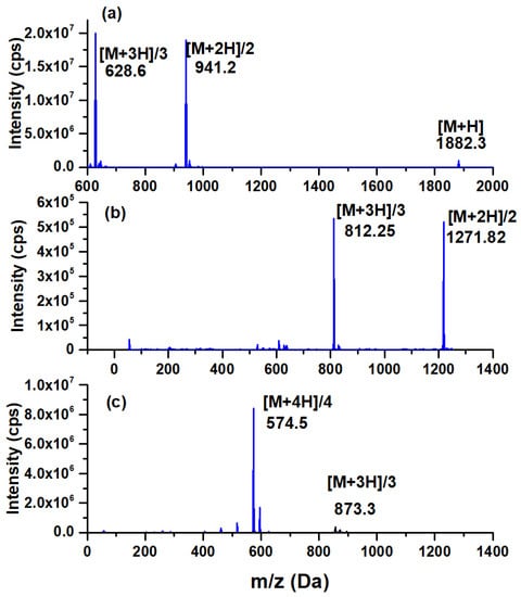 Mass spectrum of the (a) PD-L1-i peptide: cyclo(Ac-Tyr-NMeAla-Asn-Pro-His-Leu-Hyp-Trp-Ser-Trp(Me)-NMeNle-NMeNle-Orn-Cys-Gly-NH2 synthesized as previously reported [28], (b) DOTA-PD-L1-i, and (c) HEHA-PD-L1-i.