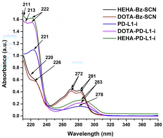 The UV-vis spectra of the PD-L1-i conjugates show several shoulders and peaks from 211 nm to 226 nm, which are assigned to the n→σ* electronic transitions from sulfur as a heteroatom (-H2C–S–CH2−), π→π* electronic transitions from double bonds within amino acid carbonyls, and –C=O from carboxylic acids. The band at 283 nm is associated with π→π* and n→π* electronic transitions (–C=C– and –C=N– groups) of the peptide side chain rings (e.g., imidazole ring) (Figure 3B). The single broad and well-defined band at 283 nm of DOTA-PD-L1-i and HEHA-PD-L1-i appears different from that of the precursors (278 nm from the PD-L1-i ligand and the 272 nm and 281 nm doublet from the DOTA-/HEHA-Benzene-SCN precursors), indicating new chemical compound formation (PD-L1-i conjugates) (Figure 3).
