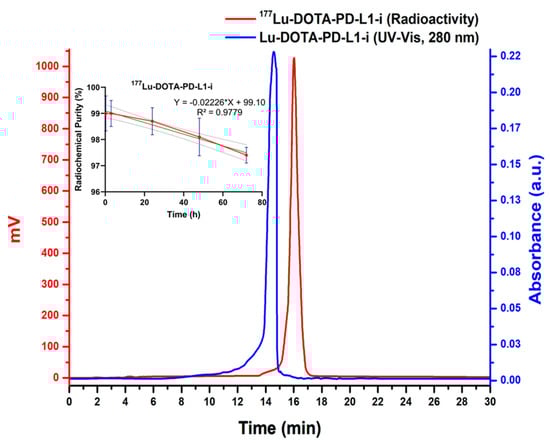 Reversed-phase UV-vis/HPLC, 0.1 mg/mL of Lu-DOTA-PD-L1-i in aqueous solution, injection of 20 µL, and reversed-phase radio-HPLC chromatogram of 177Lu-DOTA-PD-L1-i in water (ascorbic acid/sodium acetate), 37 MBq/mL, injection of 20 µL (inset: 177Lu-DOTA-PD-L1-i stability in water).