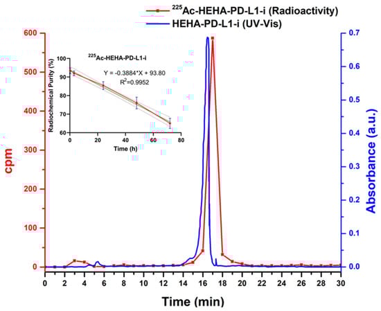 Reversed-phase UV-vis (280 nm)/HPLC, 0.2 mg/mL of HEHA-PD-L1-i in aqueous solution, injection of 20 µL, and reversed-phase HPLC separation of 225Ac-HEHA-PD-L1-i in water (ascorbic acid/sodium acetate), 1.85 MBq/mL, injection of 20 µL (graph of collected fractions) (inset: 225Ac-HEHA-PD-L1-i stability in water).