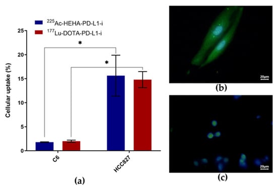 HCC827 cells (PD-L1 positive control) were found to uptake approximately fourteen times more 177Lu-DOTA-PD-L1-i and 225Ac-HEHA-PD-L1-i than C6 cells (PD-L1 negative control) (Figure 6a). The expression of PD-L1 in HCC827 cells (Figure 6b) and the lack of PD-L1 expression in C6 cells (Figure 6c) were confirmed by immunofluorescent microscopy, thus ensuring that the radiotracer uptake is specific and associated with the presence of PD-L1 in HCC827 cells. It was also proven by immunofluorescent microscopy that the PD-L1-i ligand, used in this research for 177Lu and 225Ac labeling, is recognized by the PD-L1 protein expressed in HCC827 cells (Figure 7).