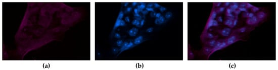 Microscopic field (40×) of immunofluorescent staining for PD-L1 with the (a) Cy7-labeled PD-L1-i in HCC827 (PD-L1+) cells; (b) DAPI staining; (c) merged image: PD-L1 stained red with Cy7-PD-L1-i and nuclei stained blue with DAPI.