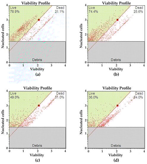Representative histograms of the HCC827 cell viability assay obtained using flow cytometry: (a) control (no treatment): basal viability of the cell population (78.9% of live cells); (b) viability after treatment with PD-L1-i (0.1 µg) for 5-h (74.4% of live cells); (c) viability after treatment (acute dose of 15 Gy/5 h) with 177Lu-DOTA-PD-L1-i (49.0% of live cells; the net decrease in alive cells regarding the control group was 30%); (d) viability after treatment (acute dose of 5 Gy/5 h) with 225Ac-HEHA-PD-L1-i (36.0% of live cells; the net decrease in alive cells regarding the control group was 43%).