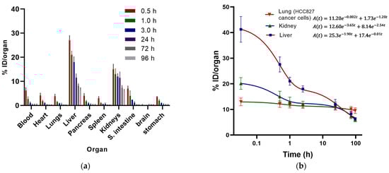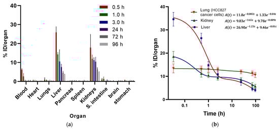 According to the biokinetic model of 177Lu-DOTA-PD-L1-i obtained in mice intravenously injected with HCC827 lung cancer cells (PD-L1+) (Figure 9b), seventy-four percent of the activity taken up in the liver was cleared rapidly (λ = 1.23), with a half-life of 0.56 h (t1/2 = ln2/λ = 0.56 h) associated with the hepatobiliary elimination, while twenty-six percent was cleared slowly (λ = 0.01; t1/2 = 69 h), possibly related to the fraction retained in the reticuloendothelial system. The short half-life time observed in the biokinetic model of kidneys (t1/2 = ln2/3.65 = 0.19 h) can be correlated with renal elimination and reabsorption in the proximal tubule, whereas the slow elimination slope (t1/2 = ln2/0.009 = 77 h) would be related to the breakdown of the peptide fragment, where 177Lu is retained for a longer time [35]. The most extended 177Lu-DOTA-PD-L1-i retention time was observed in lungs invaded with HCC827 cancer cells. Ninety percent of the lung uptake activity had a half-life of 346.5 h, and only ten percent had a half-life of 17.3 h (Figure 9b); consequently, the absorbed radiation dose delivered to the lungs was ten times that given to the kidneys and fifty times than that to the liver (Table 1).