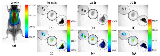 In vivo and ex vivo radioisotopic/X-ray images of athymic mice with lung micrometastases at different times after 177Lu-DOTA-PD-L1-i administration: (a) whole-body imaging; (b,d,f) X-ray images; (c,e,g) merged radioisotopic and X-ray images of kidneys (on the upper left side), lung (in the middle), and liver (on the lower right side). Note that the highest radioactivity accumulated in the lungs at all times examined (30 min, 24 and 72 h).