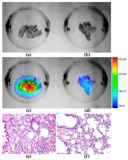 Ex vivo lungs from a mouse with lung micrometastases and injected with 177Lu-DOTA-PD-L1-i: (a) X-ray image; (c) merged radioisotopic/X-ray images; (e) lung parenchyma histological staining (H&E). Ex vivo lungs from an untreated mouse (control: without induced lung micrometastases) and injected with 177Lu-DOTA-PD-L1-i: (b) X-ray image; (d) merged radioisotopic/X-ray images; (f) lung parenchyma histological staining (H&E).