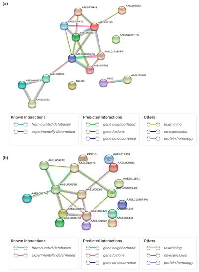 The protein–protein interaction networks of differentially expressed proteins in Ae. aegypti (a) larvae and (b) adults after EA treatment. The colored lines indicate the type of interaction evidence.