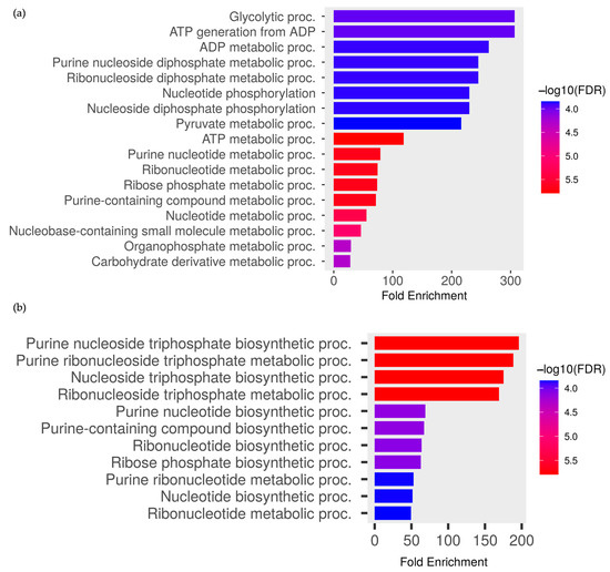 The gene ontology of differentially expressed larvae proteins in terms of biological processes and cellular components was also analyzed via ShinyGo based on the Aedes aegypti LVP_AGWG database. The FDR indicated the likelihood of the enrichment by chance while the fold enrichment showed the overrepresentation of genes of a certain pathway. The GO analysis suggested the proteins that expressed prominently in larvae were involved in 17 biological functions (Figure 2a). The glycolytic process and ATP generation from ADP showed the highest fold enrichment (306.6-fold) between other biological processes, followed by the ADP metabolic process (262.8-fold) and purine nucleoside, as well as the ribonucleoside biphosphate metabolic process (245.3-fold) (Figure 2a). The carbohydrate derivative metabolic processes have the lowest fold enrichment (28-fold) (Figure 2a). The significantly expressed proteins in adults were mostly involved in the purine nucleoside triphosphate biosynthetic process with a fold enrichment of 196.2, followed by the purine ribonucleoside triphosphate metabolic process (188.7-fold) and nucleoside triphosphate biosynthetic process (175.2-fold) (Figure 2b). The ribonucleotide metabolic process had the lowest fold enrichment (49.6-fold) compared to other biological processes (Figure 2b). The larvae and adults exhibited distinct biological profiles, with the larvae primarily focusing on energy production and metabolic processes, specifically related to glycolysis and ATP generation. In contrast, adults exhibit a strong emphasis on nucleotide biosynthesis and related metabolic processes, which may indicate an increased demand for energy production.