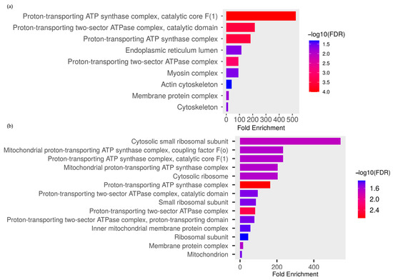 Most differentially expressed proteins in the larval stage were located in a proton-transporting ATP synthase complex (Figure 3a), whereas in the adult stage, they were located in a cytosolic small ribosomal subunit, followed by the mitochondrial proton-transporting ATP synthase complex, coupling factor F(0), and catalytic core F(1) (Figure 3b).