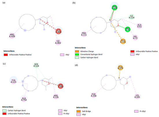 Two-dimensional diagram of the interaction between dodemorph with (a) ATP synthase subunit alpha, (b) ATP synthase subunit beta, (c) ATP citrate synthase, and (d) FBA. The diagram visually depicts the ligand–receptor interaction, showcasing distinct colors to represent the various interactions, along with the identification of binding amino acid residues within the protein’s binding pocket.
