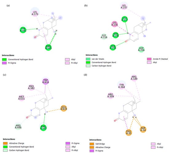 Two-dimensional diagram of the interaction between selagine with (a) ATP synthase subunit alpha, (b) ATP synthase subunit beta, (c) ATP citrate synthase, and (d) FBA. The diagram visually depicts the ligand–receptor interaction, showcasing distinct colors to represent the various interactions, along with the identification of binding amino acid residues within the protein’s binding pocket.