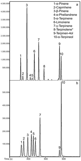 Chromatograms of GC analysis (for the mass 93) of the sample of (a) kaffir lime juice, (b) terpenes’ standard mixture, performed with the use of optimized extraction conditions, * The compound was investigated in a separate analysis. Therefore it is not shown in the chromatogram.