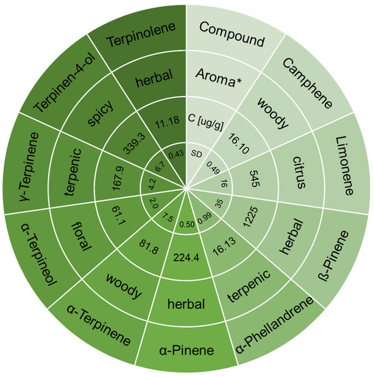 The validation parameters are presented in Table 5. The determination coefficient (R2) ranged from 0.9915–0.9995. The method’s precision was evaluated by assessing repeatability (intra-day) and intermediate precision (extra-day). A measure of repeatability, intermediate precision, and reproducibility were the standard deviation and relative standard deviation values. The precision was calculated as the coefficient of variation for all the results obtained in all the analyzed samples using the developed method (expressed as % CV, n = 7). CV ranged from 0.22% (α-Pinene) to 9.17% (α-Terpinene). The coefficient of variation of main components does not exceed 3%, and for all the rest determined compounds, CV is lower than 10%, confirming good repeatability and precision of the method. It is assumed that the developed method meets the requirements when the value of the coefficient of variation does not exceed 15% [13].