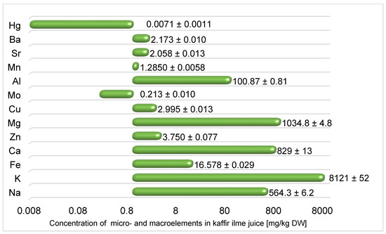 Micronutrients are trace elements that every living organism needs to function properly. For humans, the micronutrient requirement is less than 100 mg per day. Micronutrients can have different effects on the body. Iron, a component of hemoglobin responsible for transporting oxygen to the tissues in the body [41] was determined, in this study, in amounts of 16.578 ± 0.029 mg/kg DW. This is the comparable value as determined in the lemon juice samples from Argentina (15.6 ± 1.18 mg/kg). Similar results were also obtained to determine molybdenum—at 0.20 mg/kg [42]. In turn, zinc, which is involved in DNA and RNA synthesis and protein and insulin synthesis, was determined at 3.750 ± 0.077 mg/kg DW in the present study. Several essential micronutrients, including V, Ni, Cr, and Co, were below the defined LOD limits. The high content of microelements is an essential aspect of producing dietary supplements, drugs, animal food or cosmetics from plant raw materials. Therefore, kaffir lime juice may be applied in the food, agriculture, pharmaceutical, and cosmetic industries.