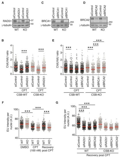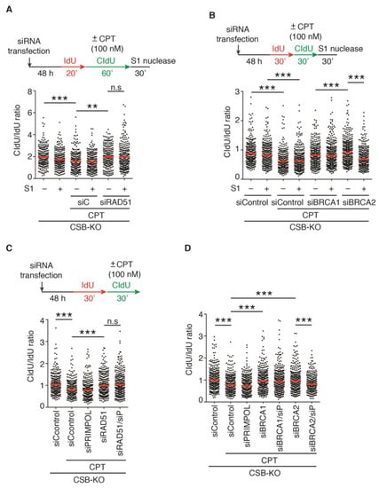 2.4. Depletion of RAD51, BRCA1, or BRCA2 Restarts DNA Replication upon Treatment with 100 nM CPT in the Absence of CSB