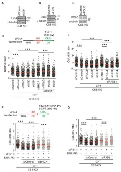 2.7. LIG3 and LIG4, Respectively, Mediate Restart of DNA Replication upon Treatment with 100 nM CPT in RAD51- and BRCA1-Depleted CSB-KO Cells